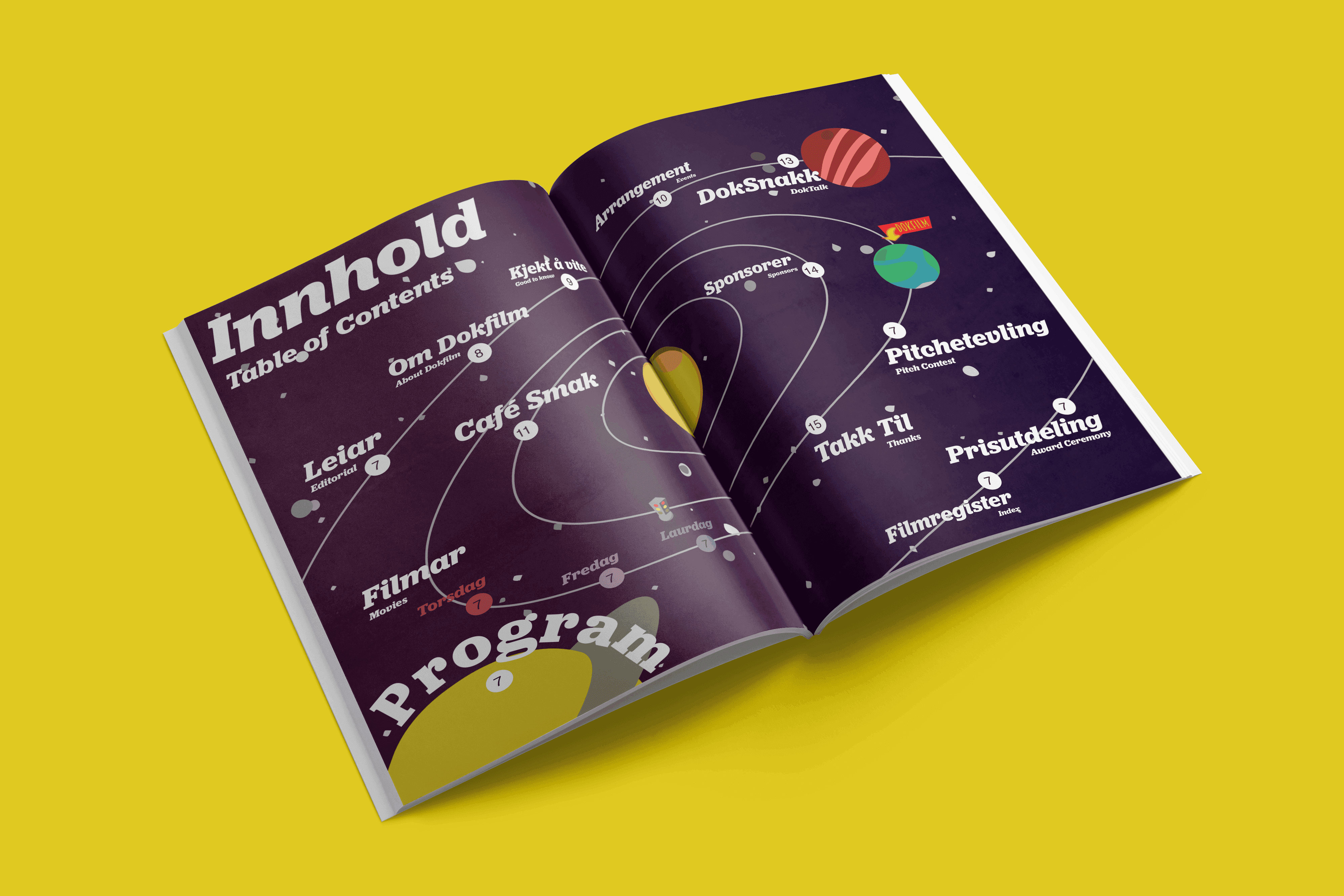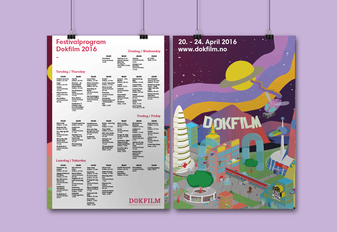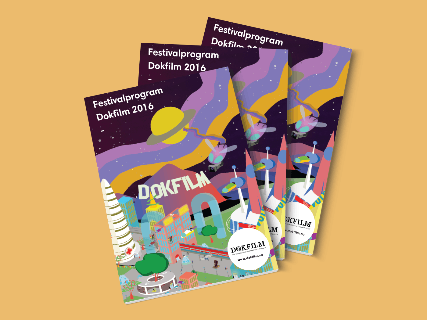 To mark Dokfilm 2016’s 20th anniversary, I developed a retro-futuristic visual identity envisioning a future Volda that remains the documentary film capital of Norway. The hallmark of this identity is a gigantic, detailed illustration intended to be used on a 10x4-meter poster wall.